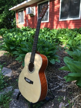 It has a 25.4 scale, 1 3/4” nut, 2 1/4” bridge spacing, Brazilian bridge and headstock veneer, and Waverly tuners. It is loud and sounds great to my ear. It should be with David Roos at www.davidroosmusic.com in a couple of weeks. I really like this guitar and will use this wood combo again.